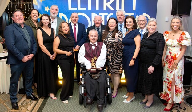 Eddie McGowan, overall winner of the Leitrim Sports Star Award, pictured with family and friends after receiving his award