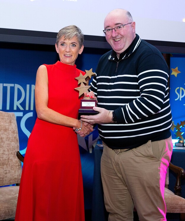 Leitrim Sports Star Awards Hall of Fame winner Ann Marie Cox receives her award from John Connolly at last Saturday's Awards in the Lough Rynn Castle Estate & Gardens Hotel