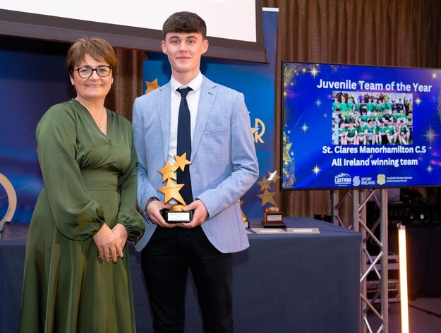 St Clare's CS Manorhamilton's Jack Kelly (right) accepts the Juvenile Team of the Year award from LCC's Suzanne Duffy, who presented on behalf of sponsors Aura Leitrim Leisure