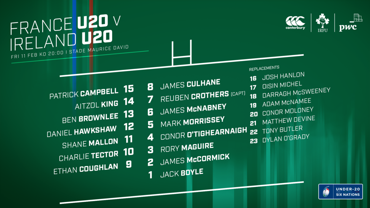 Head Coach Richie Murphy has named his Ireland U20s Match Day squad, sponsored by @PwCIreland, for Friday's Six Nations clash against France. #FutureIsGreen | #FRAvIRE