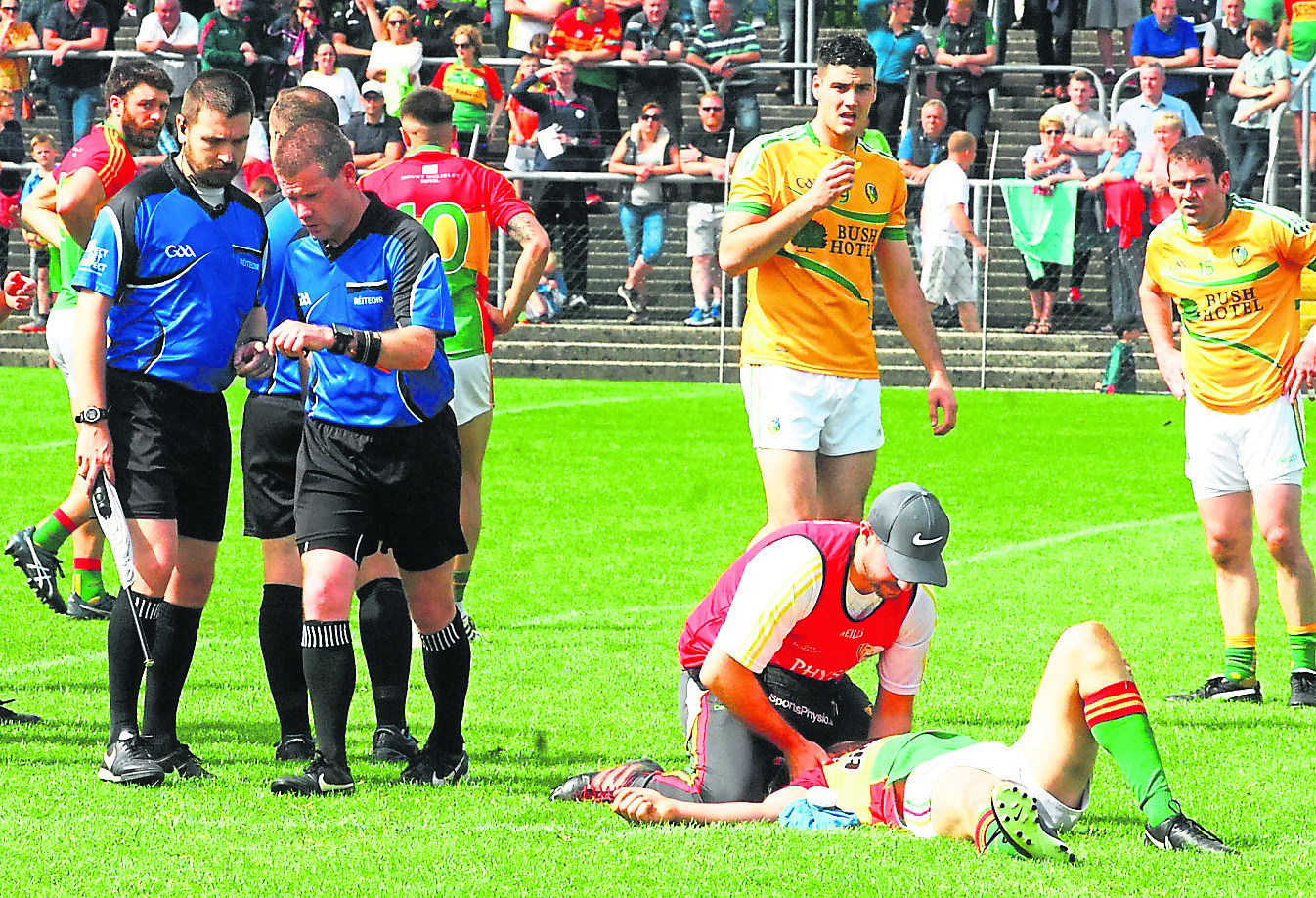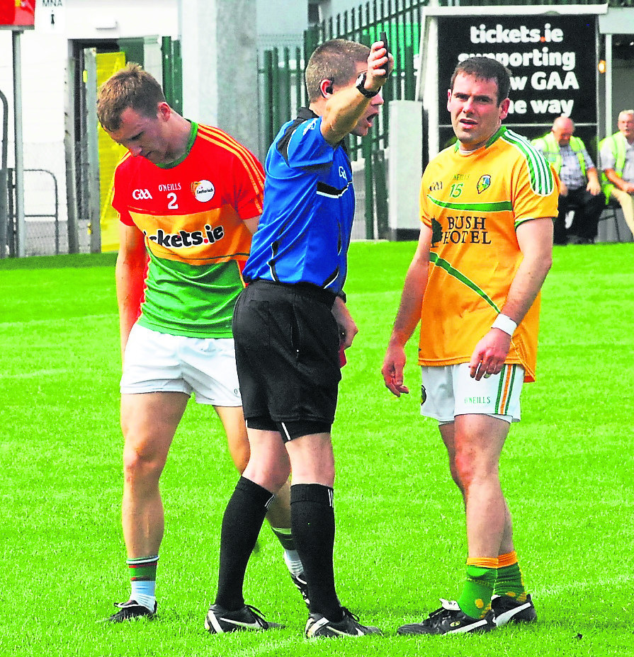 Leitrim's Brendan Gallagher and Carlow's Chris Crowley were both shown red cards for their parts in the incident that also resulted in a yellow for Gary Reynolds. Photos by Willie Donnellan.