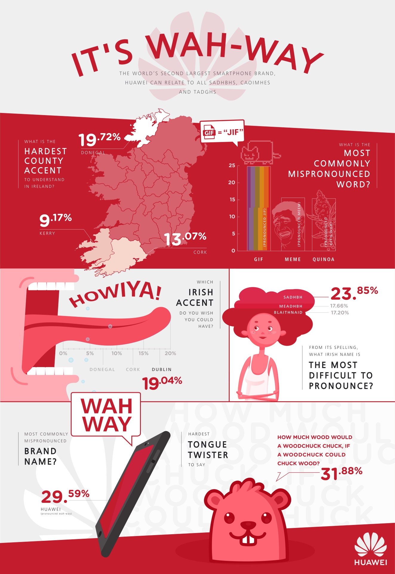 Of course, it’s not just people’s names or favourite foods that are regularly mispronounced in Ireland: brands too, suffer this same fate and the research carried out by Huawei found that more than 30% of respondents chose Huawei as the most difficult to pronounce brand name in Ireland (it’s pronounced “wah-way” by the way!).